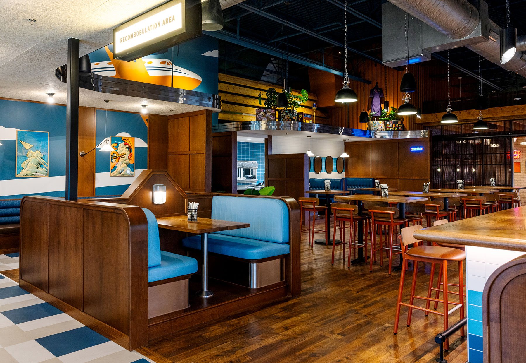 A Wisconsin developer approached Allday to create a taco restaurant that would bring a little Midwestern fun to his second home of Pinehurst, North Carolina, where dining options are limited beyond the area's well-known golf resorts. Located just a mile from Moore County Airport, the setting inspired a brand and space built on cheeky aviation references and a healthy dose of Wisco charm.